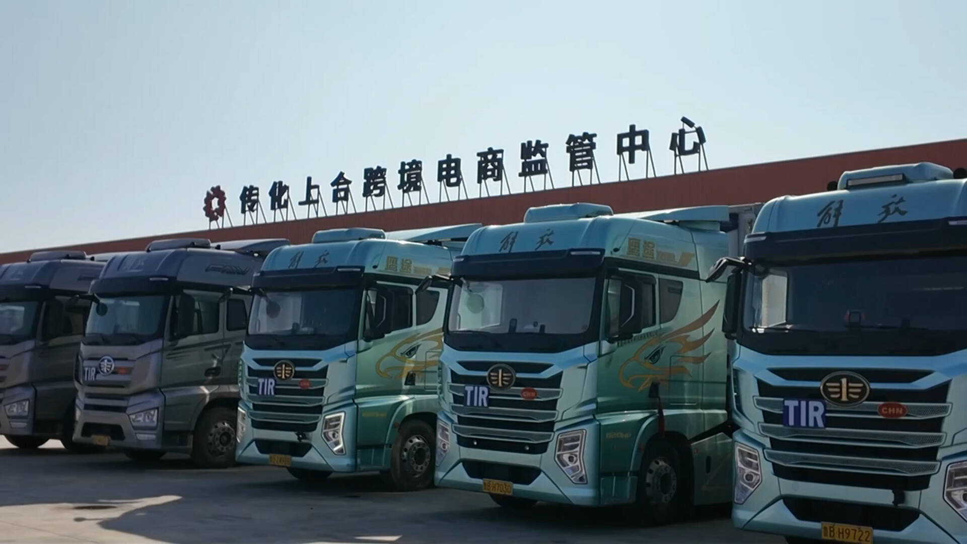 在上合示范区TIR国际道路运输集结中心,满载新鲜果蔬、机械设备、跨境商品等货物的TIR运输车辆往来不息,源源不断的中国商品经由国际公路运输,“一车到底”输送到上合组织国家商家门口。