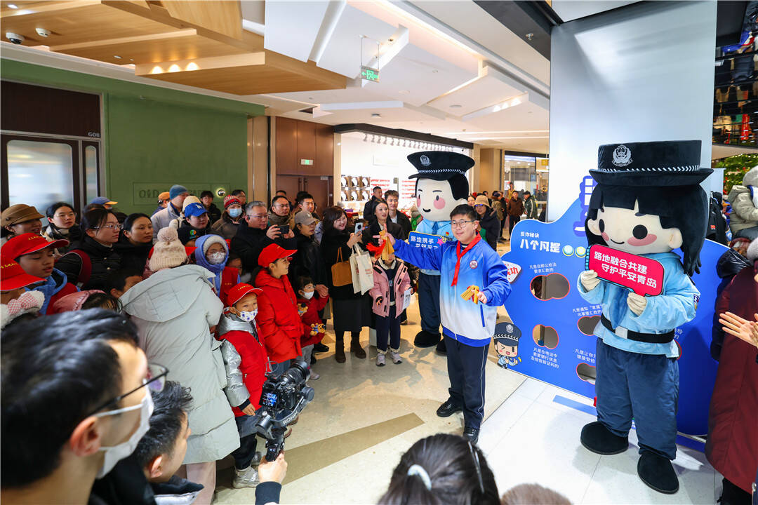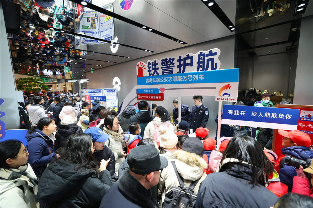 在海天MALL,公安处参与青岛市公安局举办“冬季守护·平安相伴”主题宣传暨“四十载守护平安,110勇毅前行”专题宣传活动。在这里,举行的活动创意独特,以“平安列车”为主题设计闯关集章体验。参与者持明信片车票进入三个主题车厢,完成互动任务后可获得印章奖励。现场青少年还可以换上警服,参与“警营照相馆”拍照打卡活动。活动现场,铁路公安“青小平”“铁小安”虚拟人物形象与地方公安形象共同亮相,广受欢迎。这一创新形式将铁路元素与社会面安全宣传巧妙融合,体现了路地警务在宣传策划方面的深度融合。
