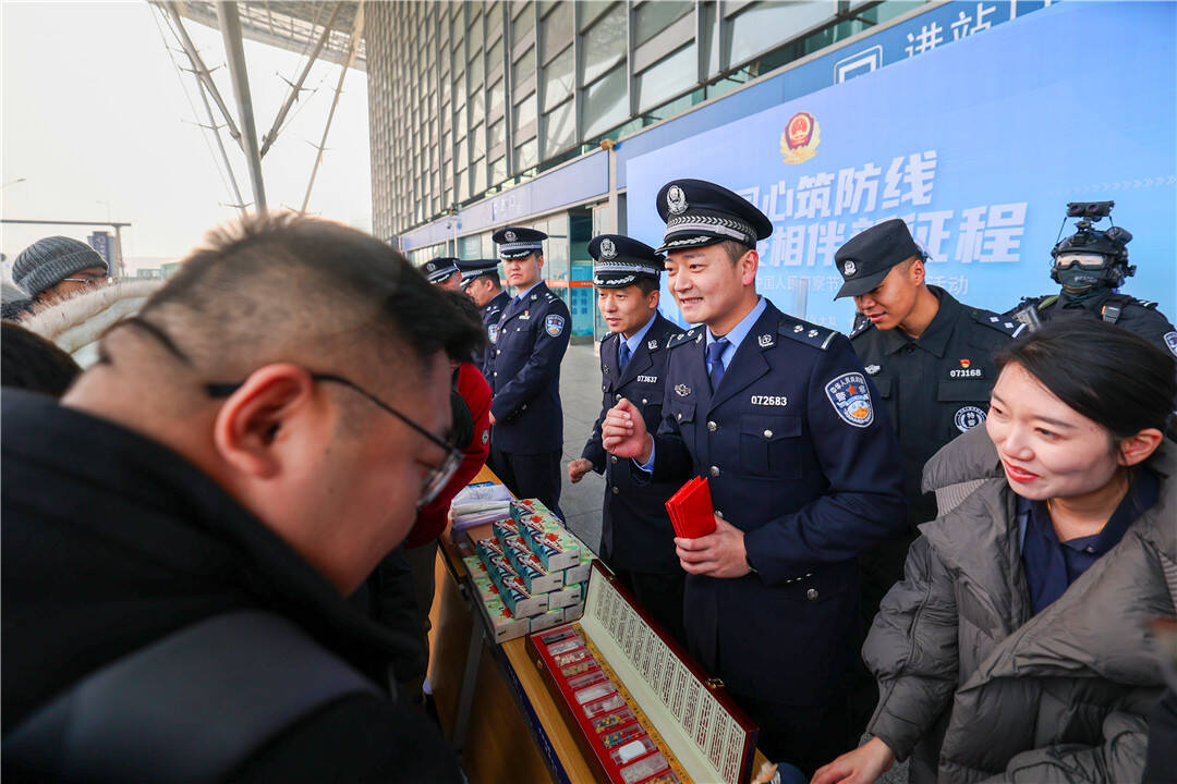 首场活动于青岛北站举行,现场设置了多个展示互动区。“沉浸式安全体验区”集中陈列了安检违禁品、毒品仿真样品及特警装备,旅客在民警指导下直观感受执法执勤工作。铁路公安与地方交警协同开展的“互动式安全宣教”成为亮点,双方通过反诈手册、安全知识转盘、现场宣讲等形式,共同普及乘车安全、交通法规和防骗知识,实现了铁路出行安全与社会公共安全宣传的有效衔接。实战技能展示环节中,警犬精准完成搜毒搜爆任务,展现了专业化训练成果,引得现场观众阵阵掌声。